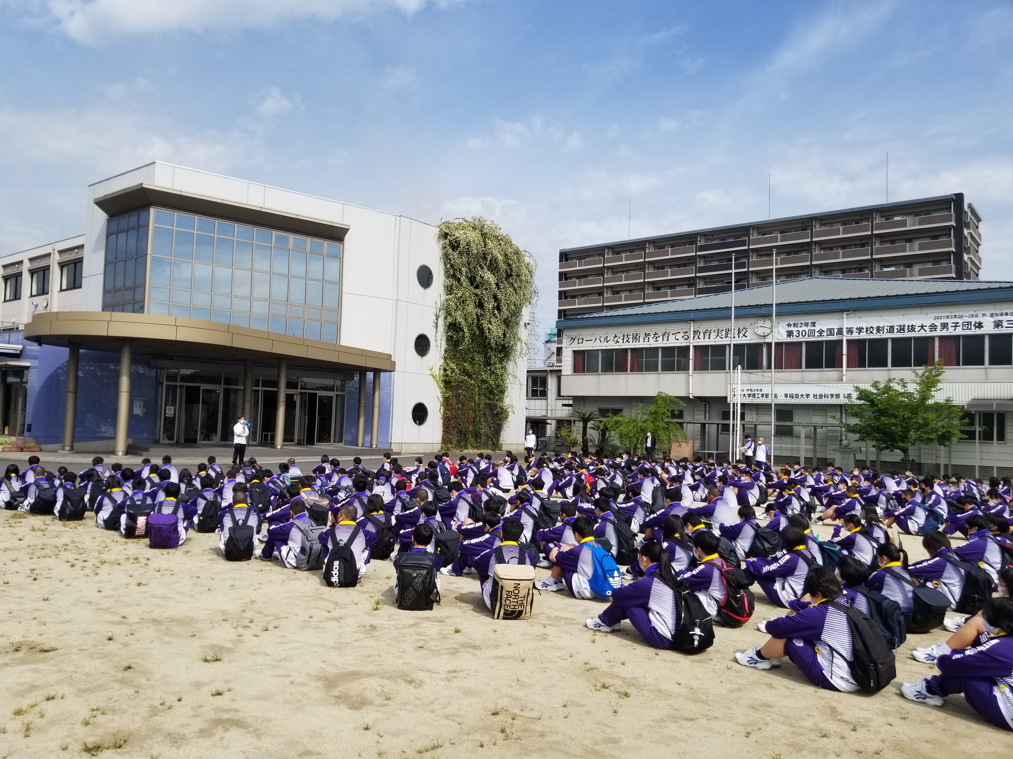 今日は快晴の中、親睦オリエンテーションを全校生徒で行いました。今回は親睦遠足に加えて、命を守る防災教育の一環として、地震時の高台避難のルート確認を行い、松栄山球場まで移動する避難訓練を実施しました。生徒たちは声を掛け合い、ルートを確認しながら歩きました。